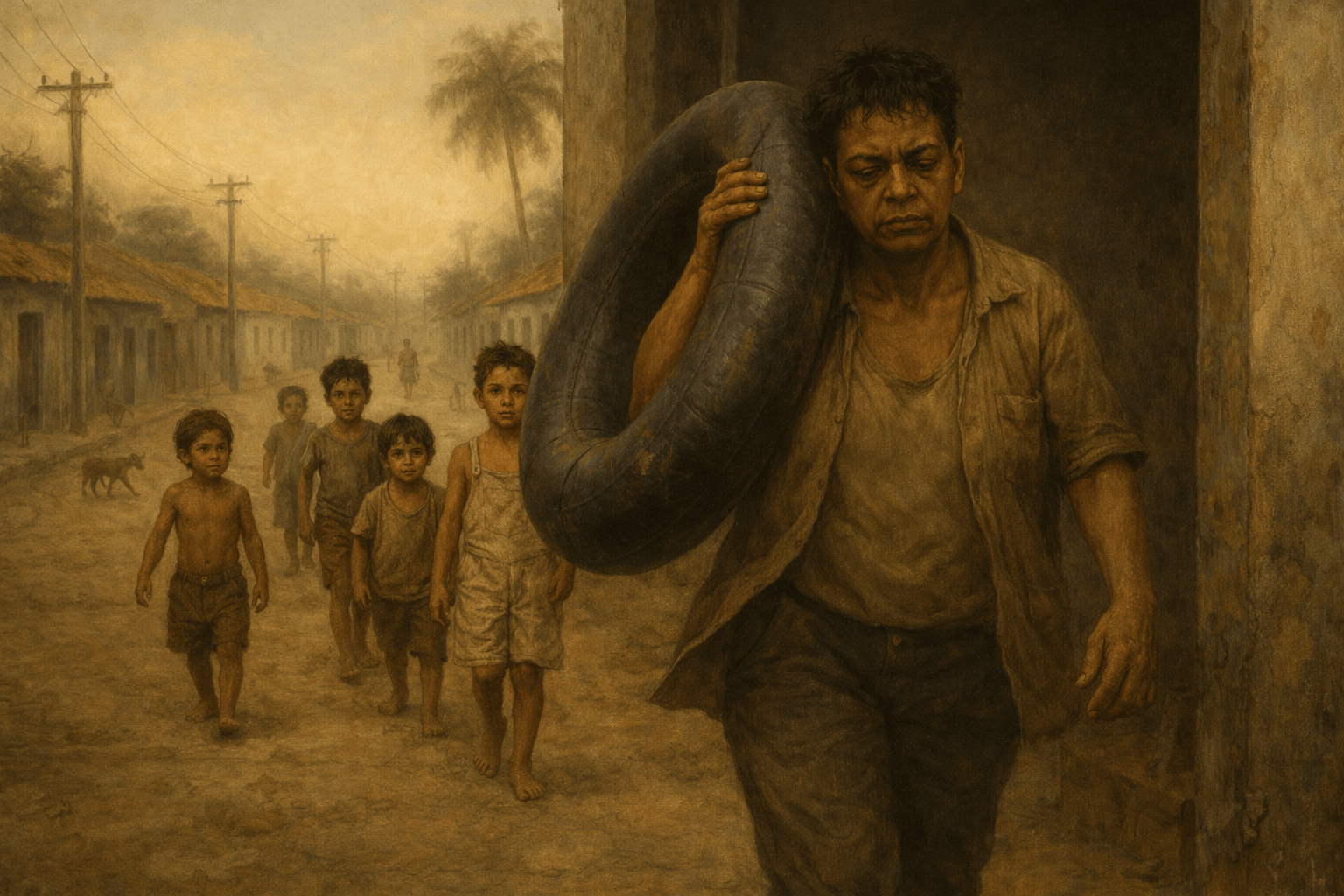 La tormenta parecía un castigo de la Madre de Aguas, ofendida por la pretensión de embuste que había guiado los actos de la Bizca: posar como mártir ante los ojos del barrio. El viento la empujó hacia el norte y ella, que ya estaba endrogada y que había aprendido a nadar en un curso por correspondencia, no se atrevió a lanzarse del neumático para alcanzar la orilla.